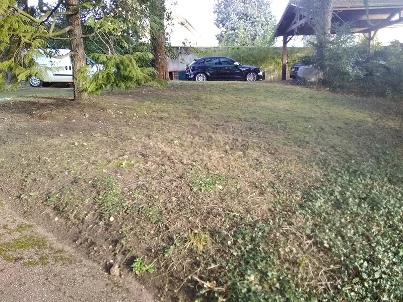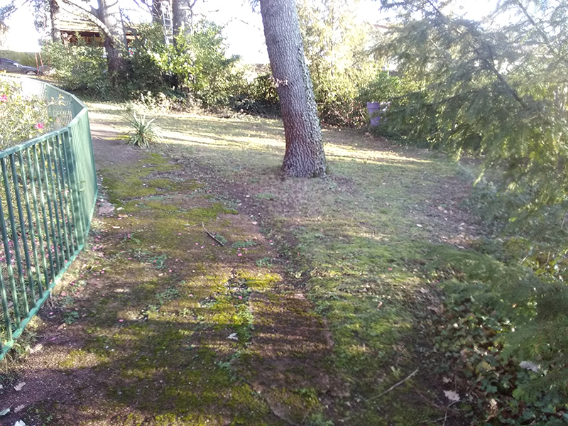Remplacement d’un gazon végetal par un gazon synthétique Naturel 35 posé sur concassé avec une fixation invisible en périphérie avec des pointes de 160mm.